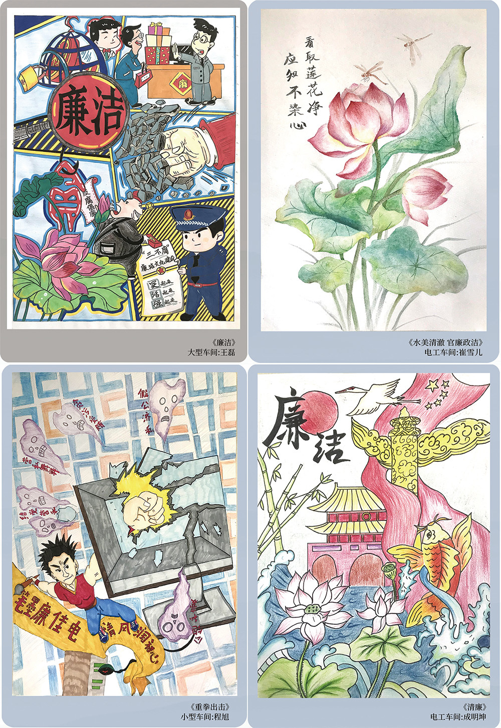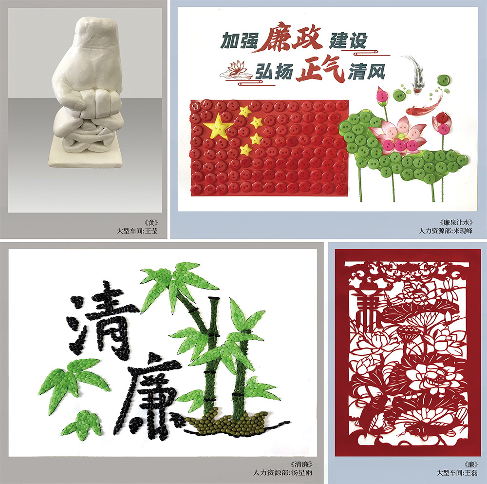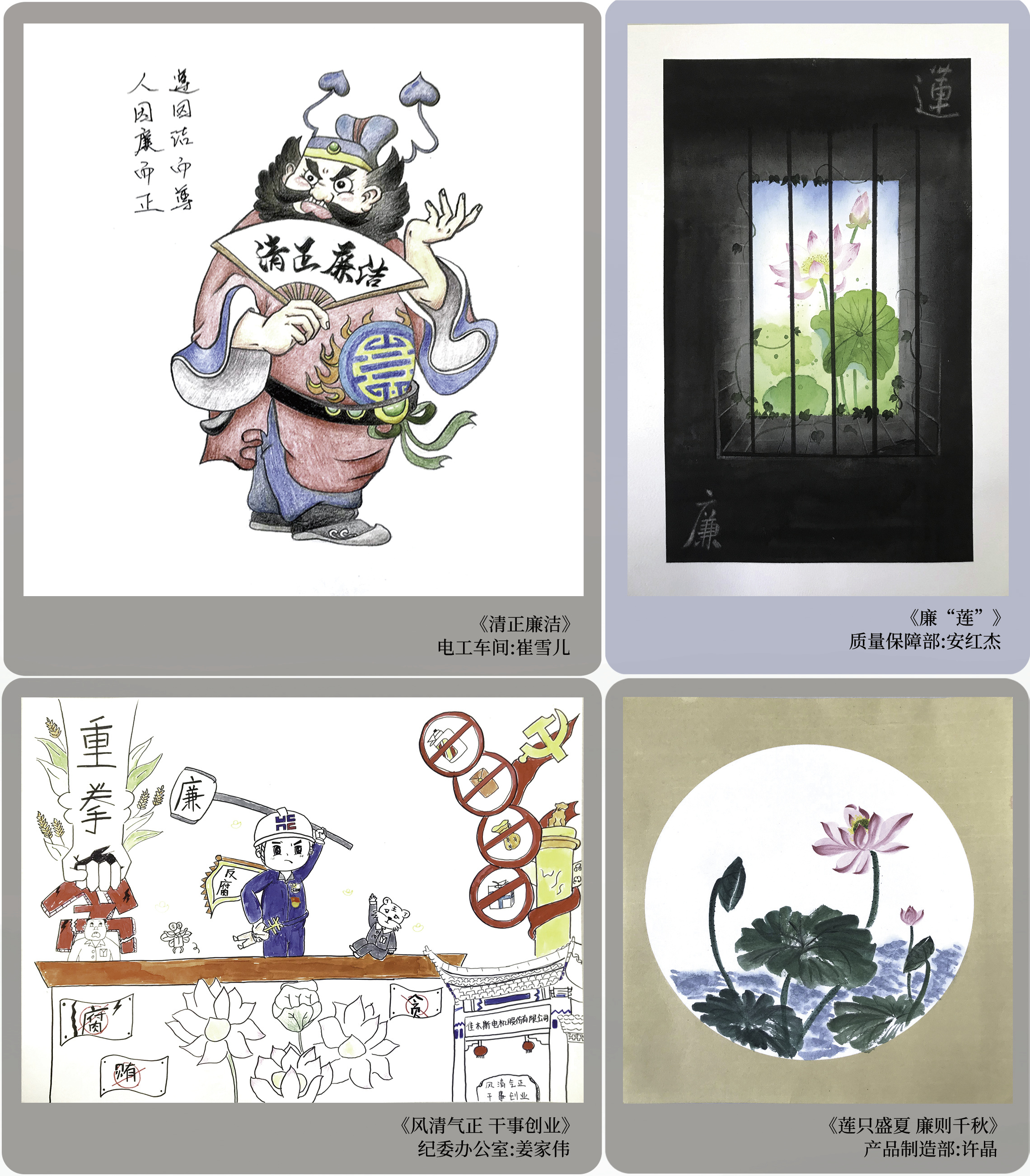 书画言志,金石寄情。作品中既有以寓意廉洁高尚的“莲”“竹”为元素的绘画和幽默风趣、构思巧妙的漫画,以廉政诗词、格言警句为内容的书法作品,也有惊艳夺目、精美细腻的五谷粘贴手工艺品,还有通过职工视角、别具一格的构思,演绎拍摄出2138cn太阳集团城廉洁文化故事。通过这些作品实现了廉洁文化与书画艺术充分融合,增强了廉洁文化教育的吸引力、说服力、感染力和穿透力,展现了2138cn太阳集团城广大党员干部职工防微杜渐、廉洁从业的信心和决心。