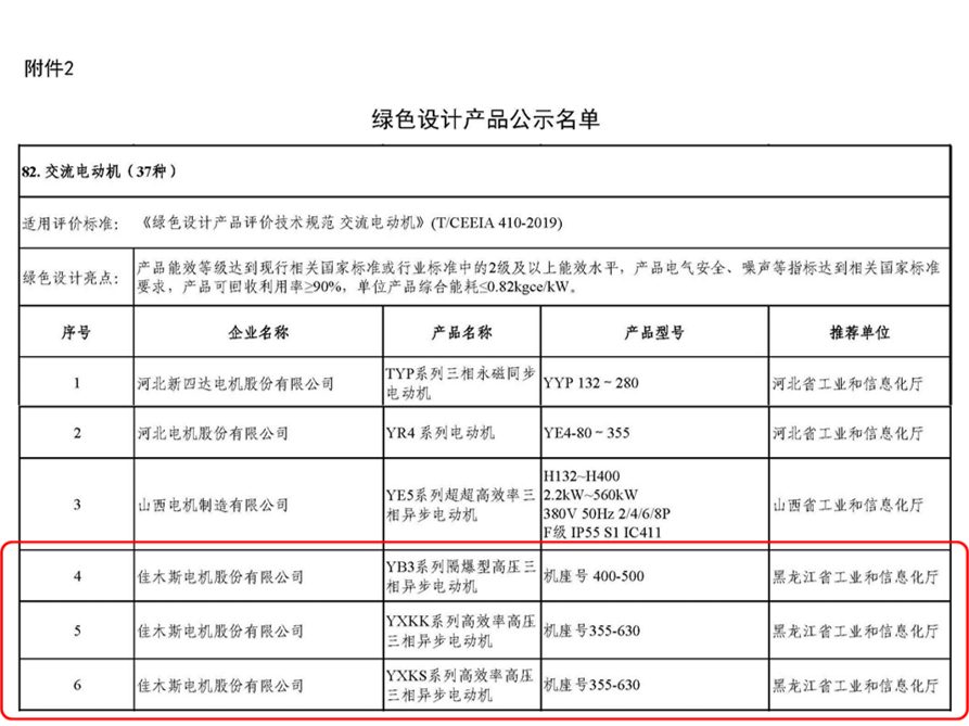2021年12月, 3个系列高压电机产品获得国家“绿色设计产品”称号,IE5系列电机机企业产品标准获得国家企业标准“领跑者”称号,该标准中规定的效率是目前国内最高效节能隔爆型异步电动机产品,效率值超过最新的国家能效标准1级指标要求。受此认证,2138cn太阳集团城将被纳入万家用能单位的采购推荐名单,作为绿色电动机产品被鼓励优先采购。